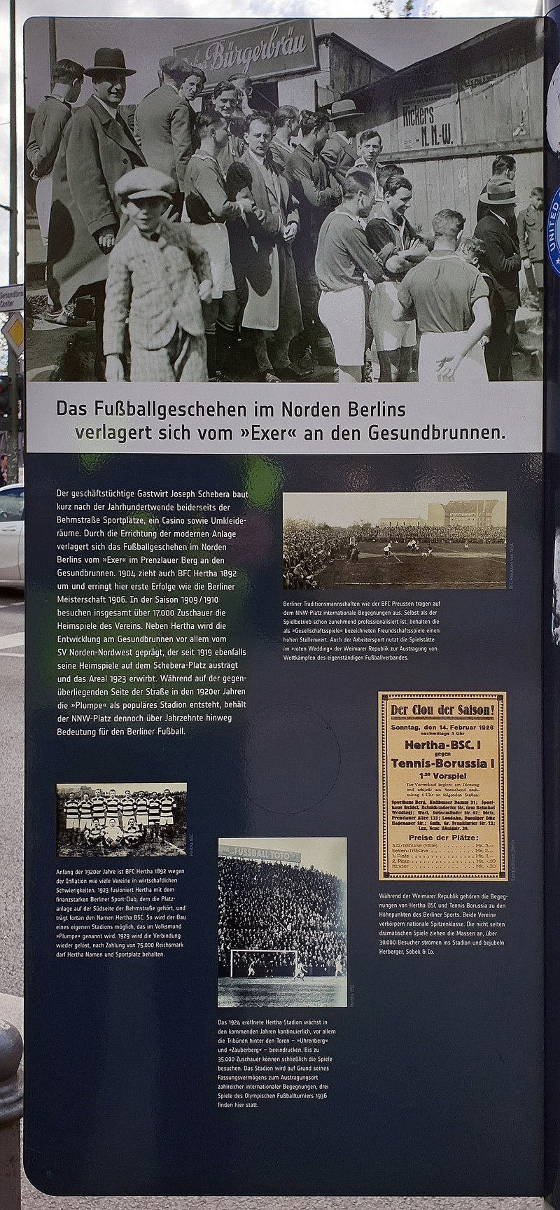 Nach dem Ende des zweiten Weltkriegs wurde die Holztribüne verfeuert; die Überbleibsel der Tribüne kann man heute noch sehen. Erstligafußball wurde hier noch in der Saison 1959/1960 gespielt, als der SV Norden-Nordwest in die erste Liga aufstieg. Und dann irgendwann hat auch der JFK hier angefangen zu spielen. Ausführliche Informationen zur Geschichte des Platzes gibt es auf Wikipedia.