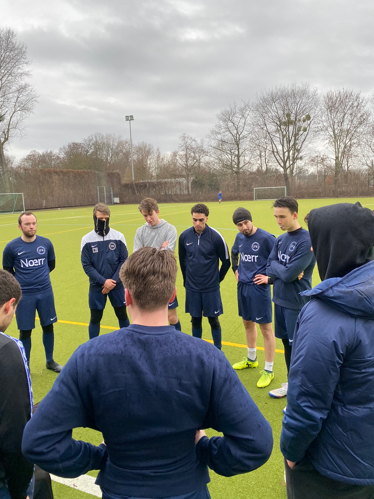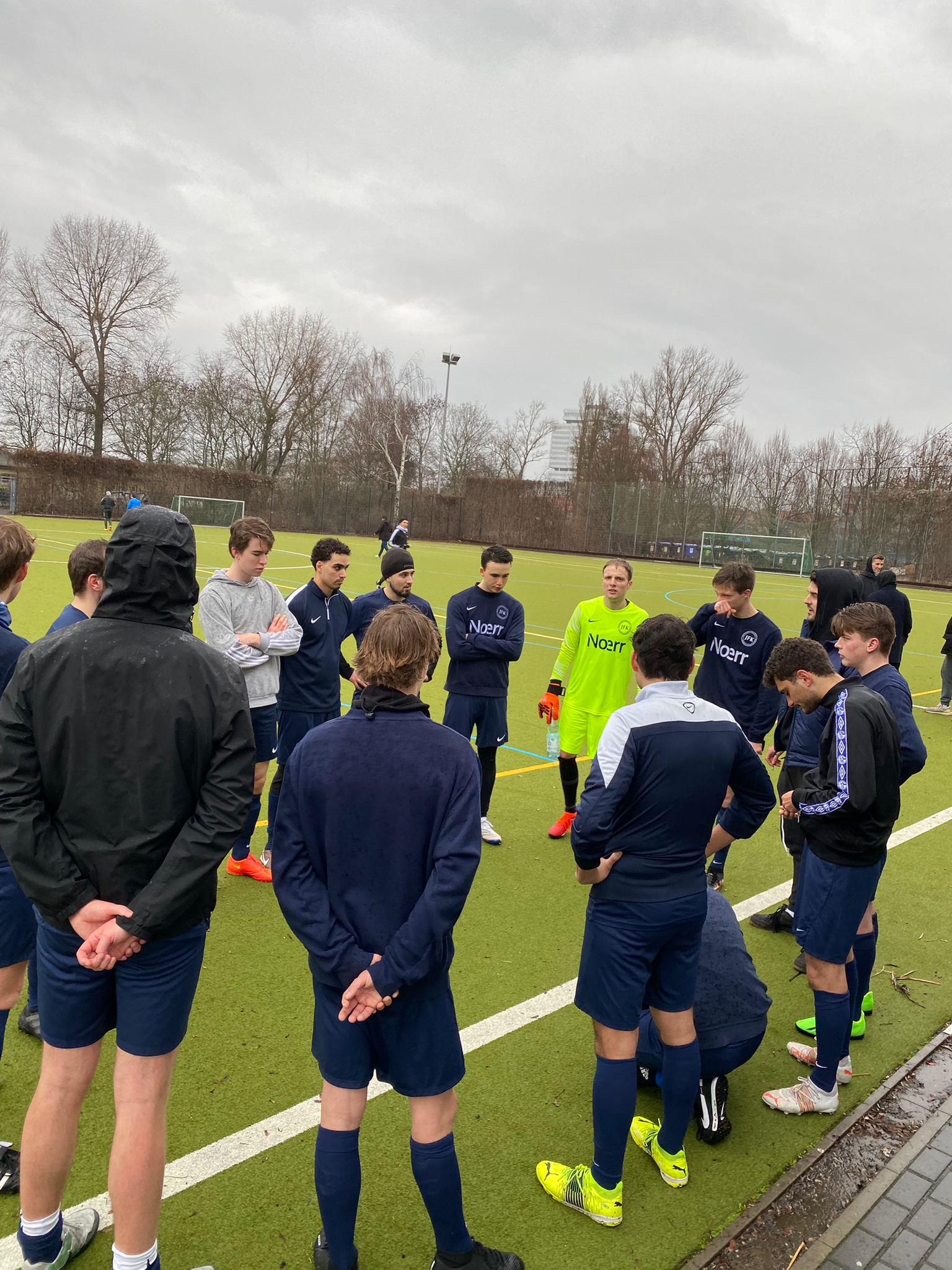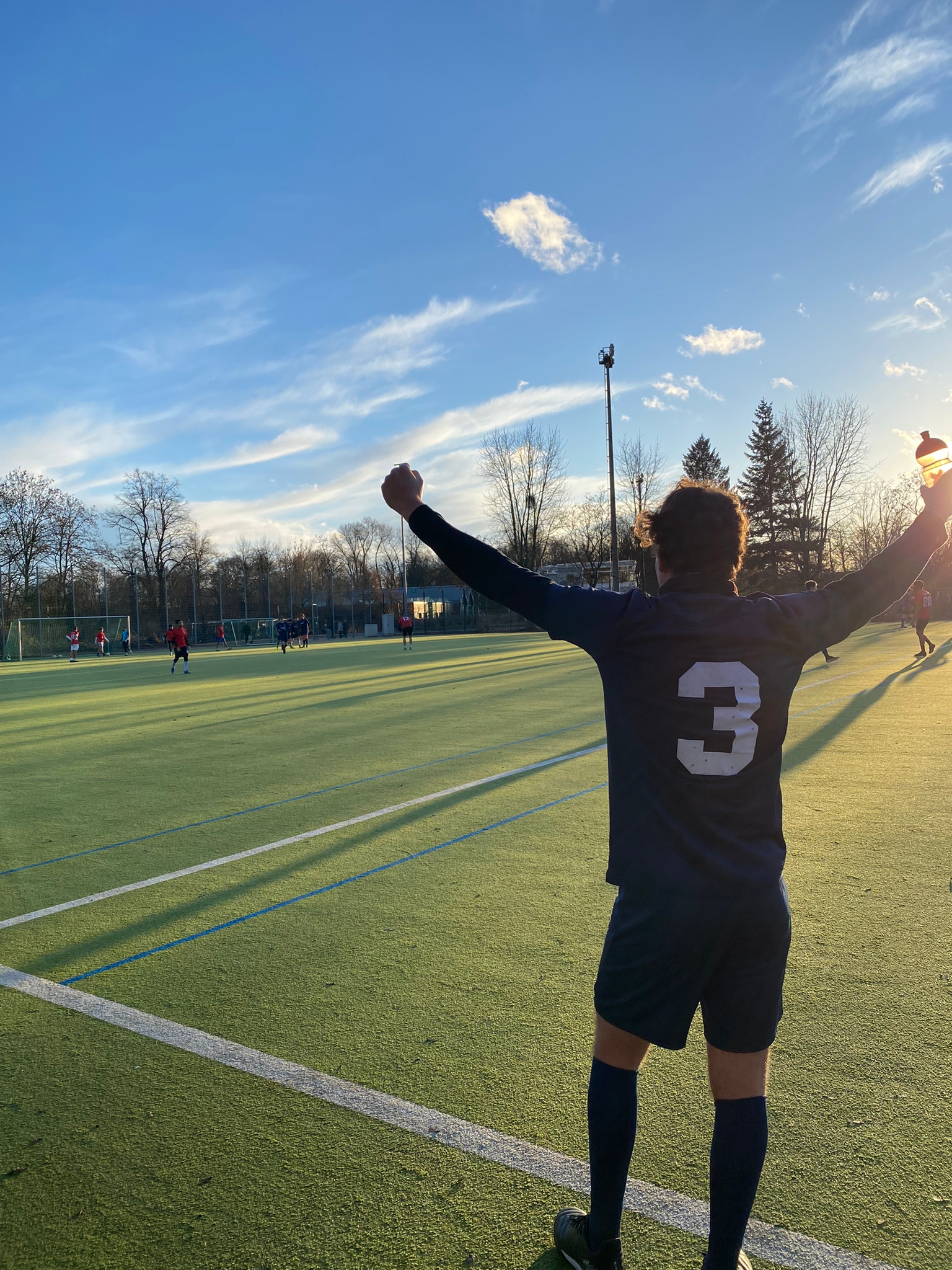 In der zweiten Hälfte gewinnt die Mannschaft in Blau langsam aber sicher die Oberhand, sie geht 3:2 in Führung. Wenig später trifft Noah, nun auf seiner vertrauten Position vorne, nach einer Zuckerflanke, mit athletisch gestrecktem Bein zum 4:2. Bei den Gegnern wächst sichtlich die Frustration, denn mittlerweile hat sich der Coach selbst eingewechselt und steht samt Schal und Schiebermütze auf dem Platz. Durch besonderes Können fällt er allerdings nicht auf, eher durch seine ausgeprägte Körperlichkeit. Der bockstarke Lenni straft die nachlässige gegnerische Abwehr ab und trifft zum entscheidenden 5:2. Sechser Yassin beackert das Mittelfeld und läuft und läuft als gäbe es kein Morgen. Auch Stathis steht nun wieder auf dem Platz und brilliert mit einem Dribbling durch die gegnerischen Mittelfeldspieler. Als er doch noch von einem gestoppt wird, wird der Gegner kurzentschlossen umgegrätscht. Man muss auch körperliche Präsenz zeigen! Kurz vor Schluss kommt Sina noch einmal. Ein Spieler steht bei einer Flanke – in den Worten der JFK Abwehr „wie Ronaldo in der Luft“ – und nickt, vorbei am sonst erstklassigen Keeper Simon, zum 5:3 Endstand ein. Der zweite Sieg im zweiten Spiel, ein Traumstart für die U23, die sich so auf den zweiten Platz in der Tabelle kämpft.