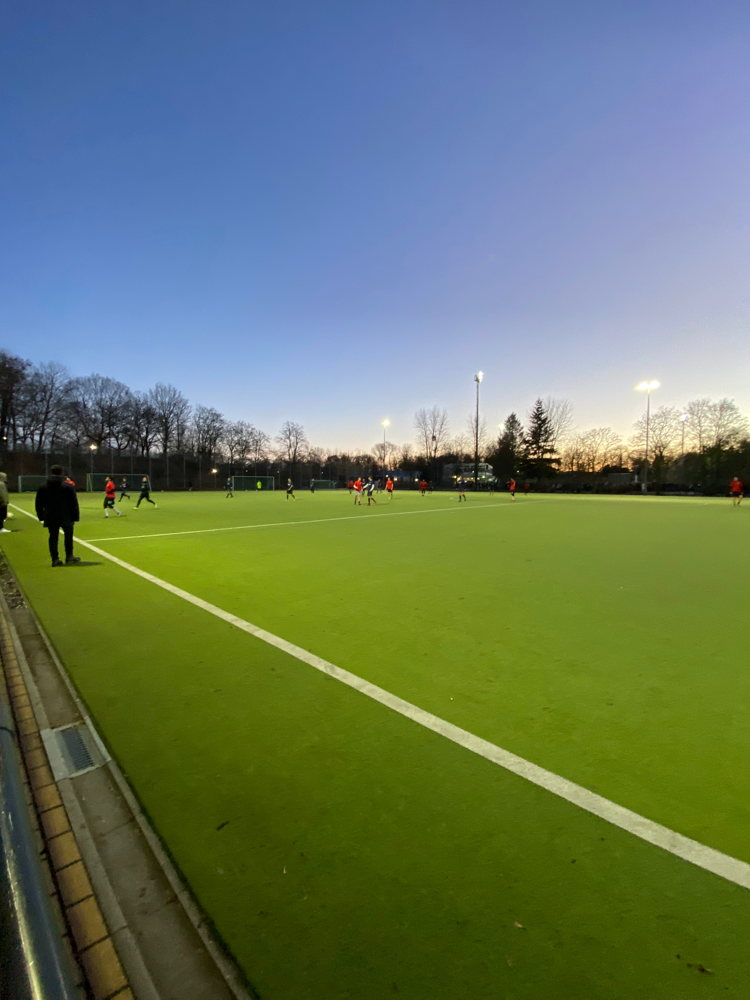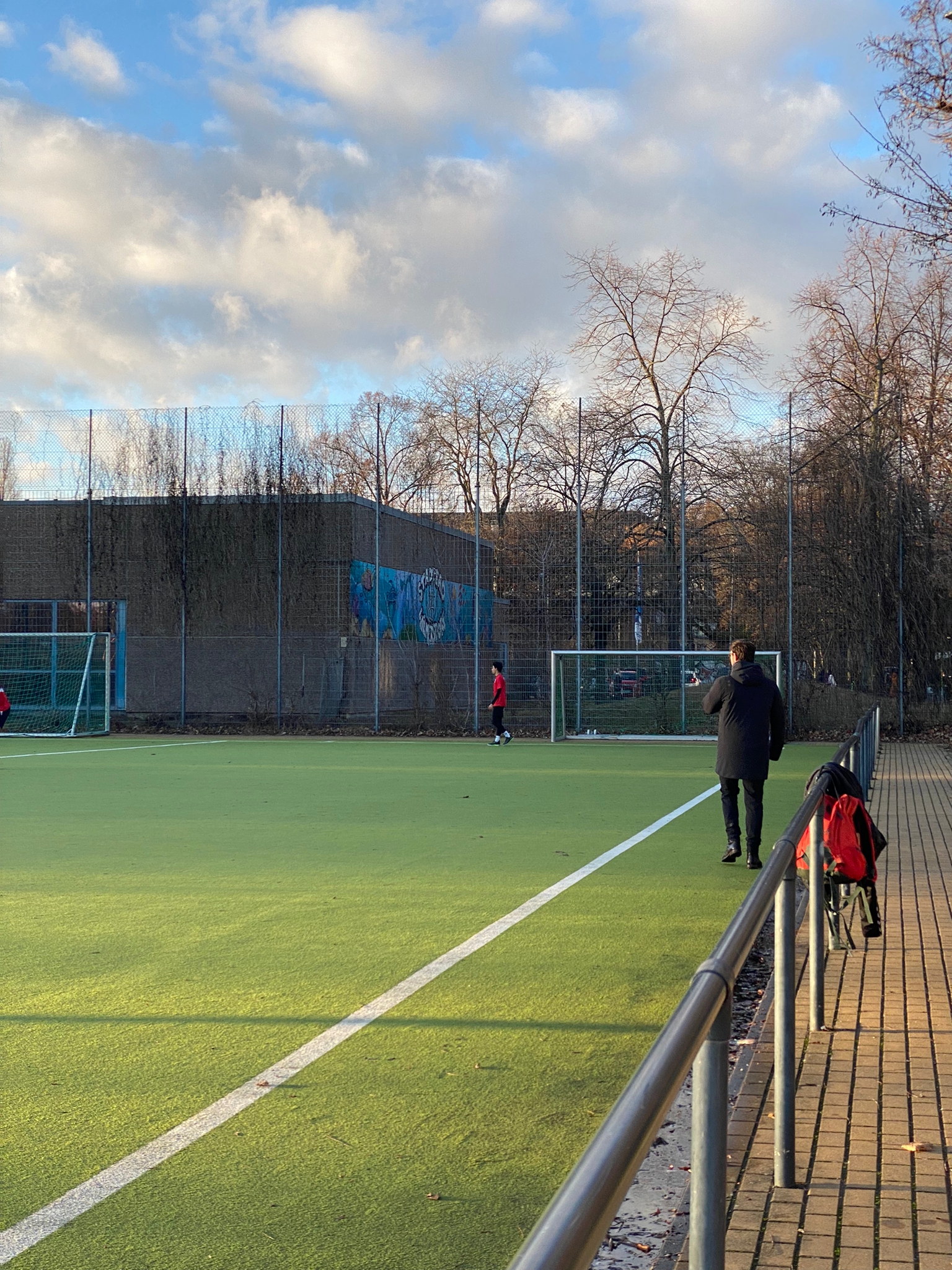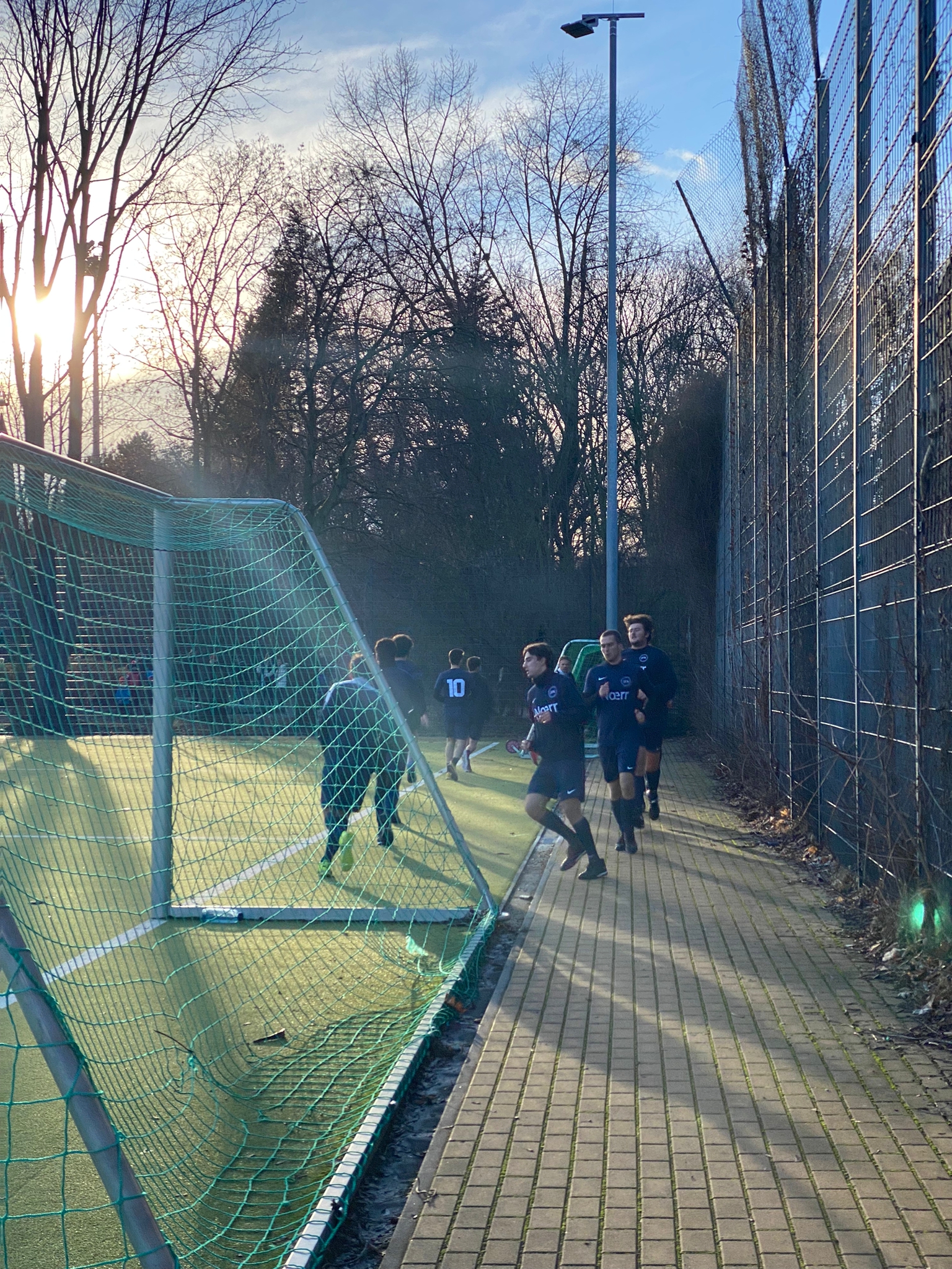 Schon am nächsten Sonntag soll an diesen Erfolg angeknüpft werden. Der Spielort ist der gleiche, nur der Platz nicht. Im goldenen Licht der untergehenden Sonne startet das Spiel. Der JFK ist in Topbesetzung, selbst auf der Bank ist genügend Talent zum Einwechseln. Neuzugang Stathis darf bei seinem Debut für die U23 direkt von Anfang an spielen. Nach circa zehn Minuten dann jedoch der Schock: Er muss raus, dafür muss Noah, eigentlich ein klassischer Stürmer, in die Außenverteidigung. Als Stathis an der Bank ankommt die Diagnose: Nicht etwa der Knöchel streikt, sondern die Lunge. Da muss das Trainerteam wohl wieder vermehrt Sprints einbauen. Die Gegner, der FC Sina, können, besonders vorne, ganz ordentlich kicken. Sie gehen mit einer Direktabnahme à la Mbappé im WM-Finale in Führung. Beirren lässt sich davon beim JFK selbstverständlich niemand, der Ausgleich folgt prompt. Kurz darauf lässt Edeltechniker Ammar einfach mal aus 30 Metern einen los: ein Traumtor zum 2:1! Die Gegner gleichen aber vor der Pause wiederum aus, es geht mit einem Unentschieden in die Pause.